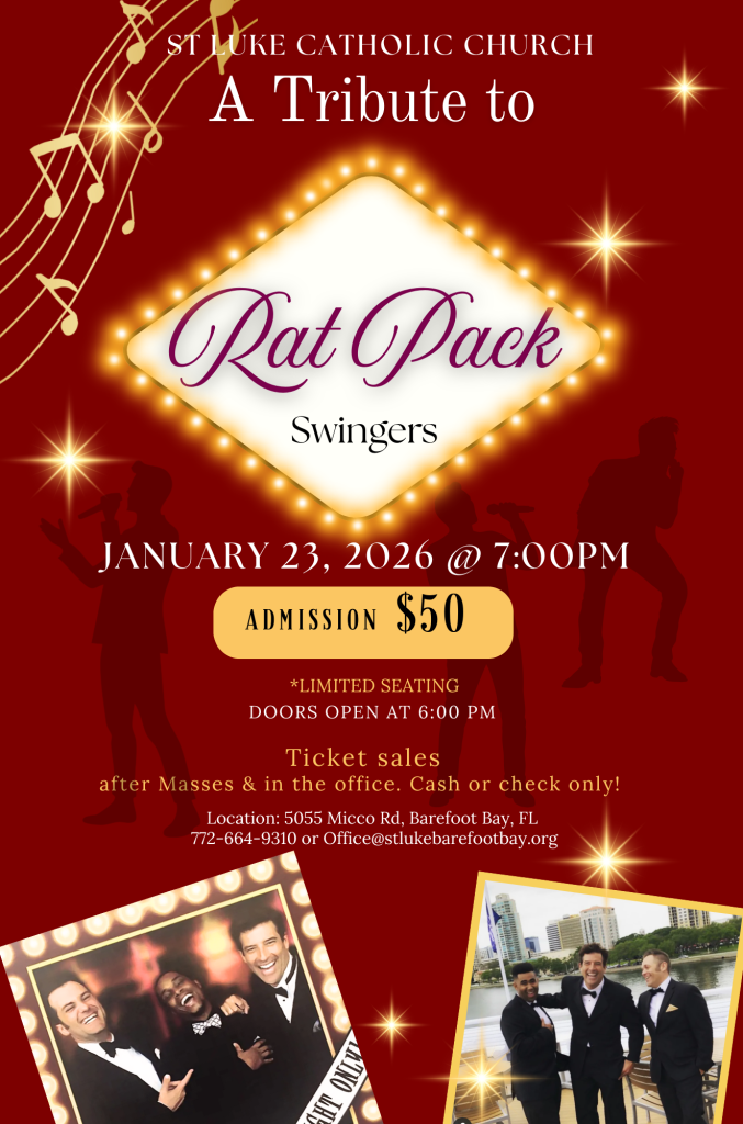 Tribute to the Rat Pack! January 23, 7:00pm Tickets available in the Church office or at the door! For more information contact the office at 772-664-9310 772-664-9310. HOR D’OEUVRES & DRINKS WILL BE SERVED DURING INTERMISSION.